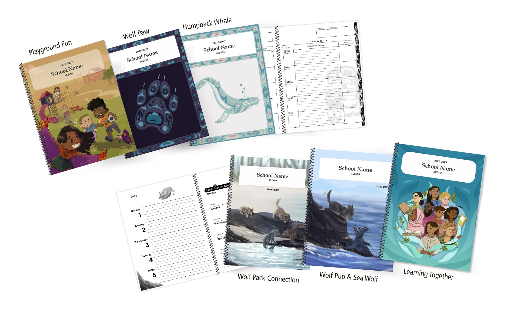 Our student agendas are printed on 20-pound paper, spiral bound, include a vinyl storage pocket, and feature full-colour front and back laminated covers.