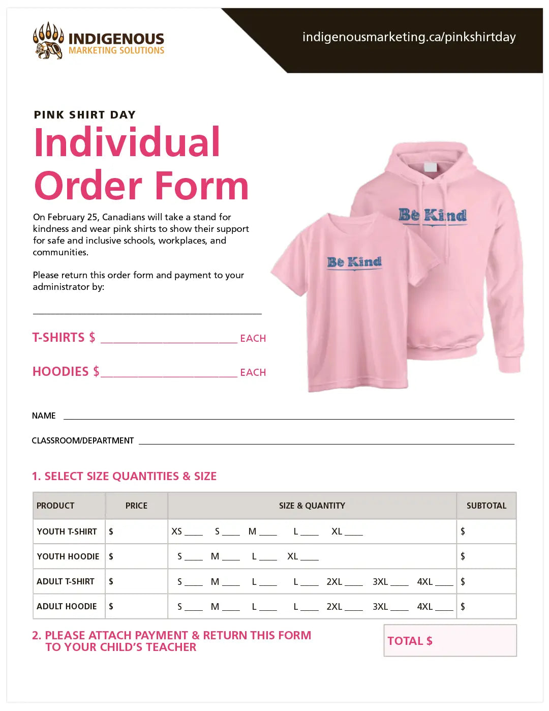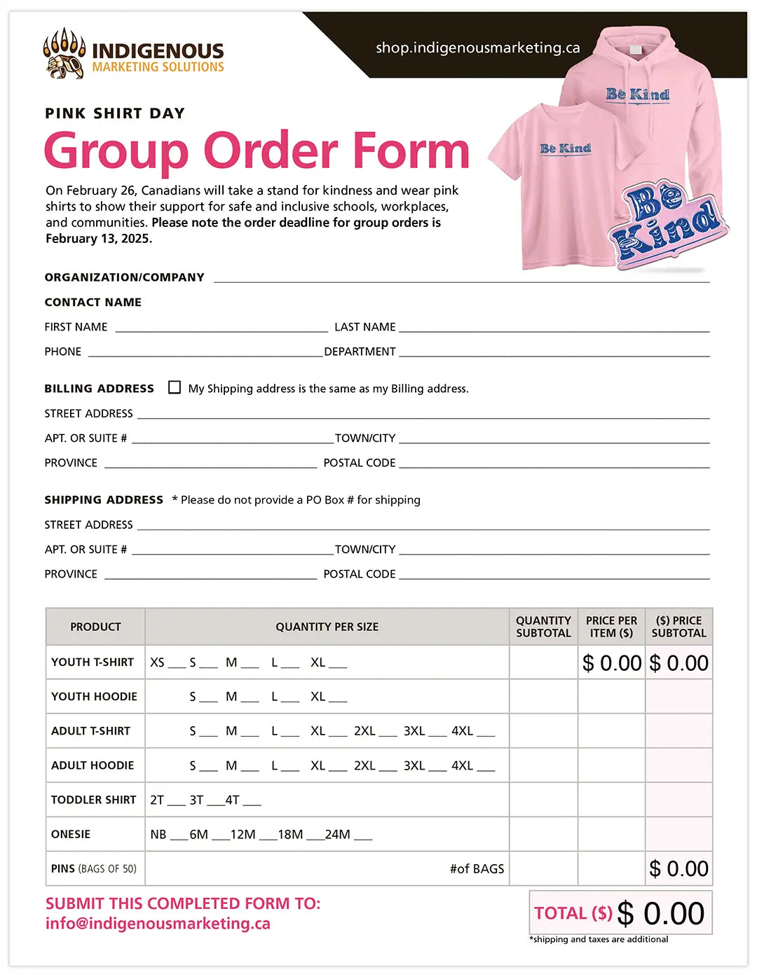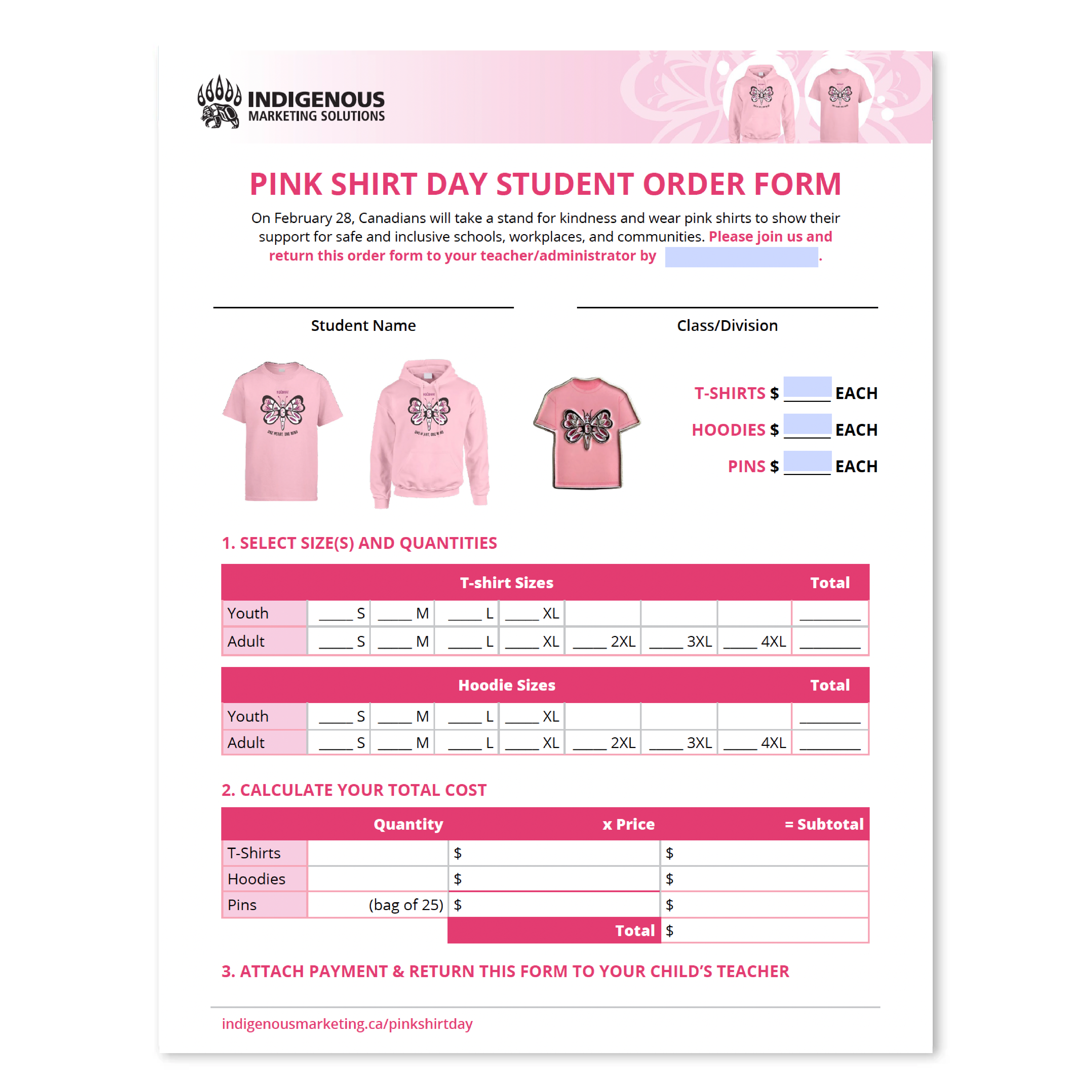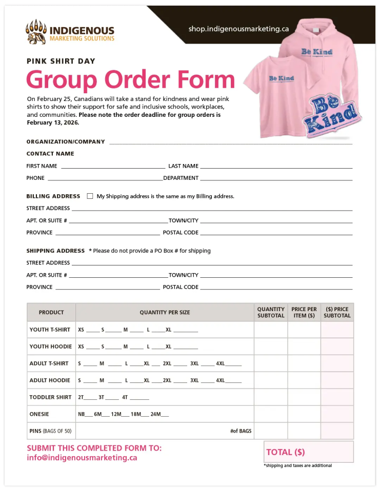Compile all the orders and fill out a single copy of the order form. Submit the order form to info@indigenousmarketing.ca to place your order.
